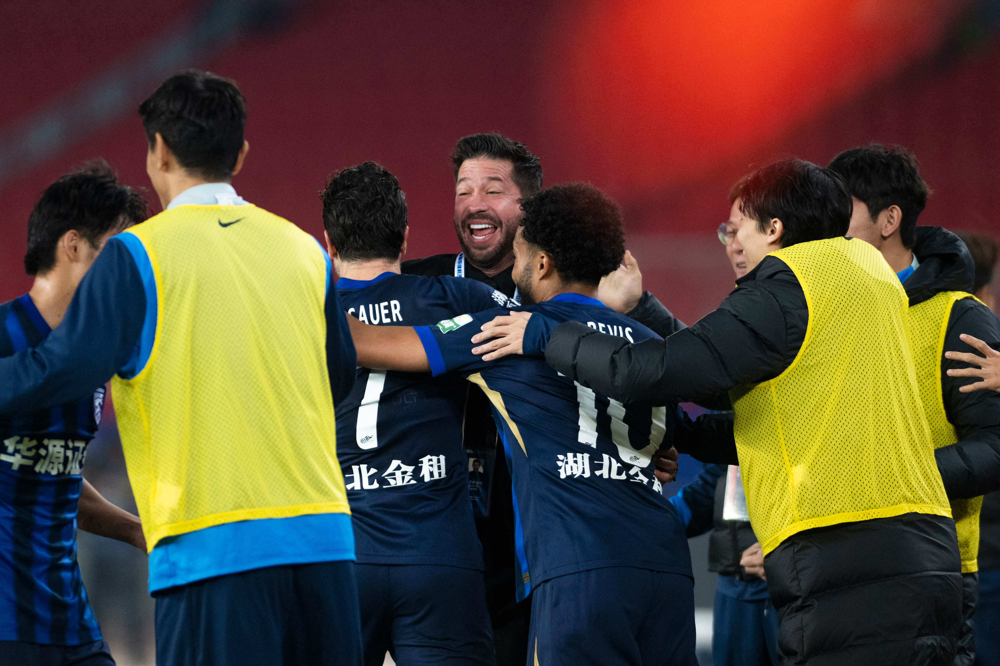 3月13日,武汉三镇队主教练本杰明·莫拉(左四)与队员庆祝进球。