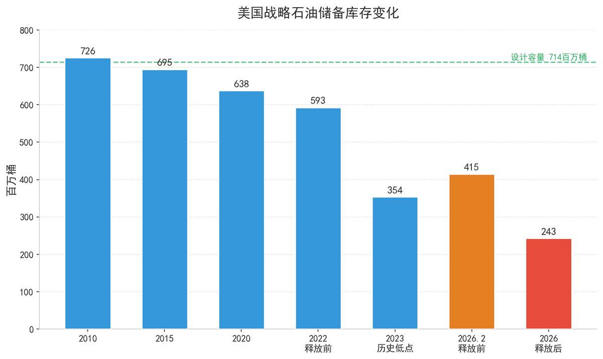 值得注意的是,这次抛储还有一个隐性代价。美国SPR在释放前约4.15亿桶,释放172万桶后只剩约2.43亿桶,相当于设计容量7.14亿桶的三分之一。2023年拜登政府释放1.8亿桶后SPR一度降至3.54亿桶的历史低位,好不容易回补了一些,现在又要大幅消耗。能源部长赖特表示将在一年内回购2亿桶来补充,但以目前的油价水平,回购成本将远高于当初的释放价格。