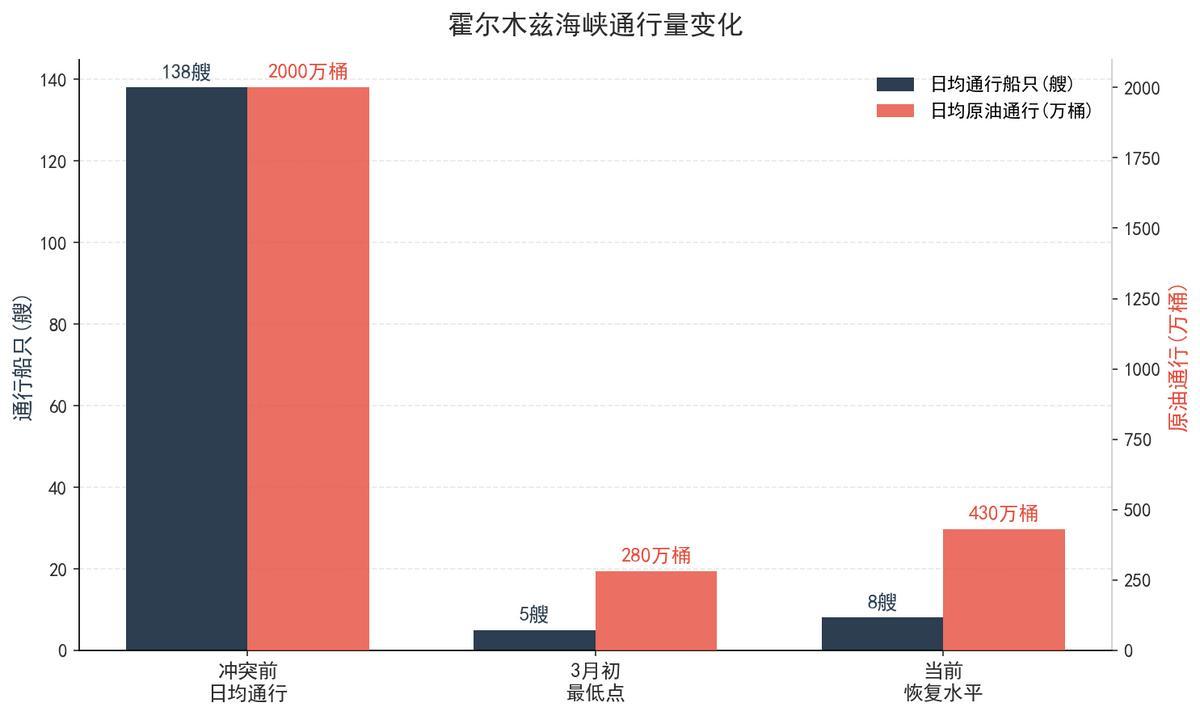 霍尔木兹海峡在冲突前每天有大约2000万桶石油通过,承载着全球约21%的石油贸易量。冲突爆发后,海峡日均通行船只从138艘骤降至不到8艘,降幅超过94%。据Kpler的追踪数据,3月初最严重的时候,单日通过海峡的原油仅280万桶,相当于正常水平的七分之一。