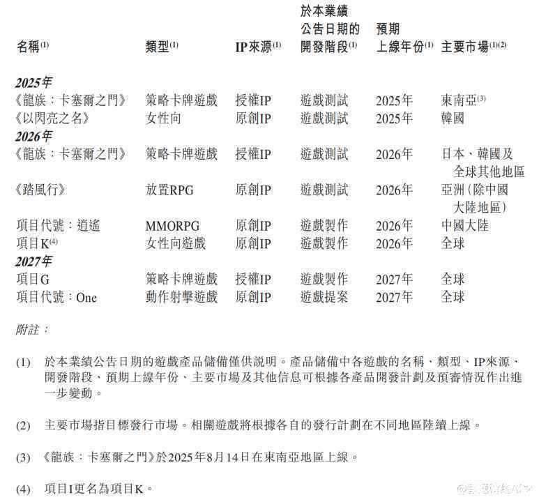 策略卡牌类产品《龙族:卡塞尔之门》,2024年9月上线国服,上线后持续一周霸榜iOS游戏免费榜榜首,且连续多日冲入游戏畅销榜前十名,首月流水超过1亿元。2025年4月上线中国港澳台地区,预下载阶段登顶iOS游戏免费榜榜首,随即取得中国香港和中国台湾地区iOS游戏畅销榜第五名和第六名的成绩。新游戏《踏风行》作为一款虚幻引擎4打造的中国风修真放置RPG,该游戏5月在中国大陆上线后,预下载当日即登顶iOS游戏免费榜。