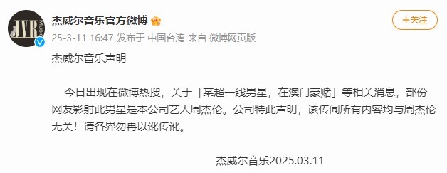周杰伦经纪公司杰威尔音乐也曾就此事发布声明表示,“出现在微博热搜,关于「某超一线男星,在澳门豪赌」等相关消息,部分网友影射此男星是本公司艺人周杰伦。公司特此声明,该传闻所有内容均与周杰伦无关!请各界勿再以讹传讹。”